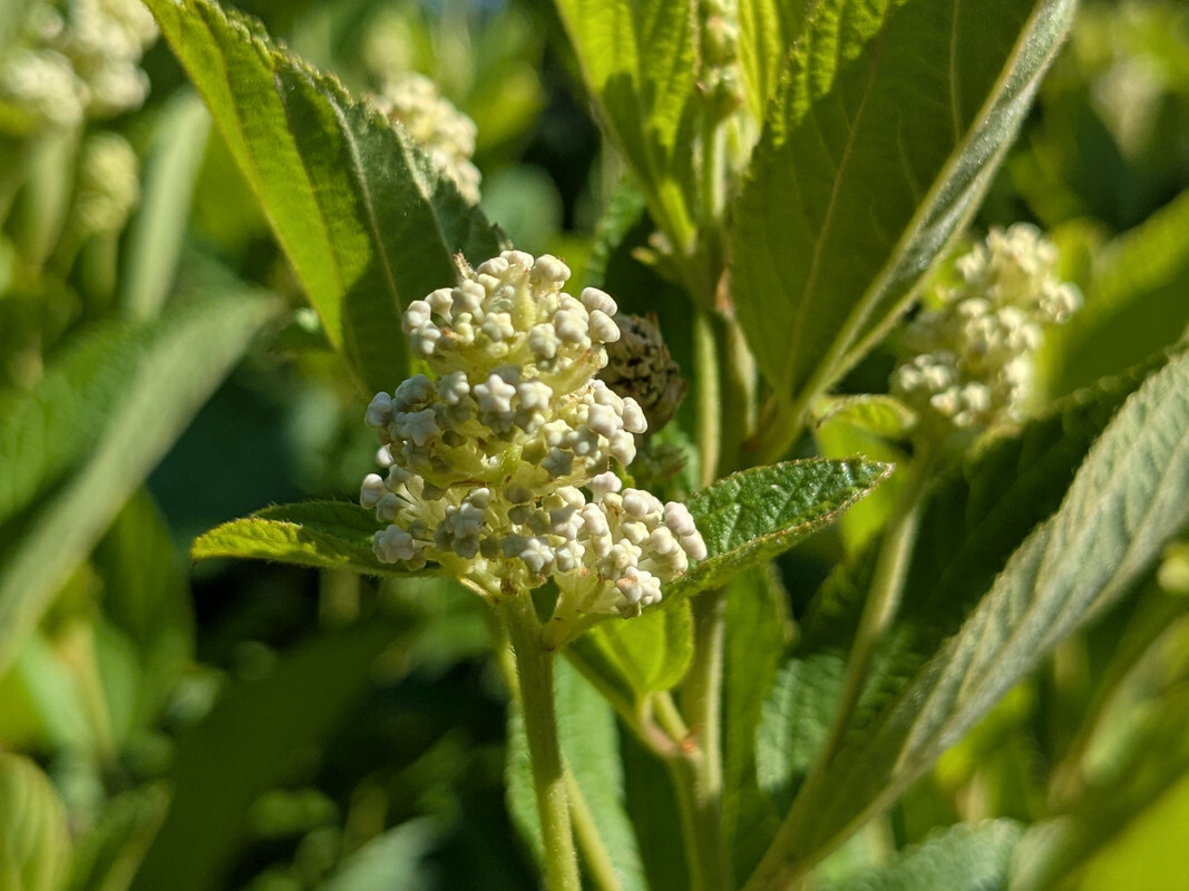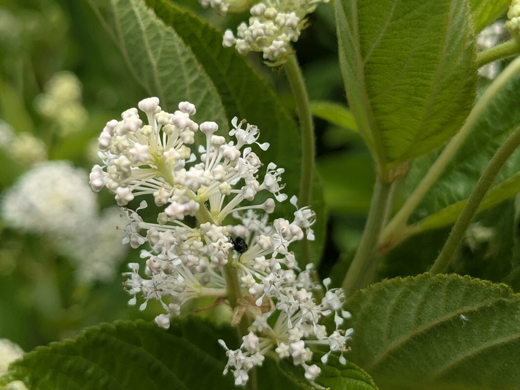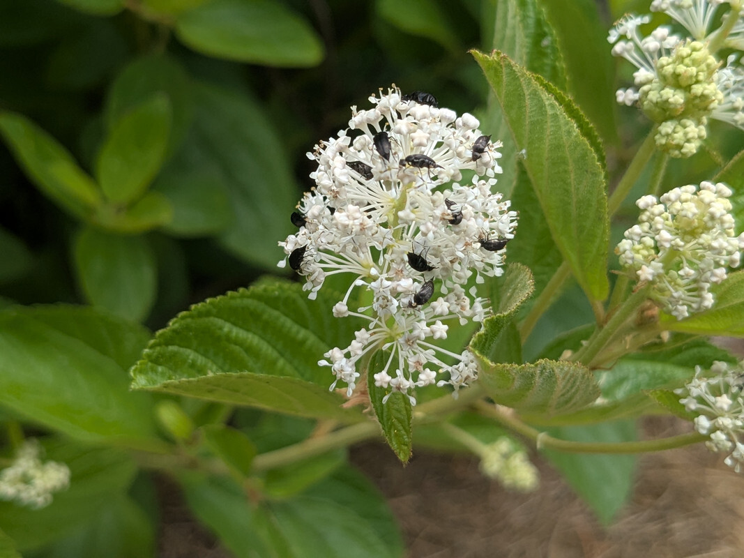 My Ceanothus americanus is flowering and absolutely crawling with insects. Below are pictures of the star-shaped flower buds before bloom and then some more of the blooms themselves
