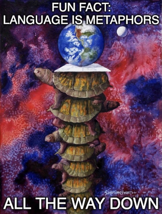 You obviously know nothing about language. When I say “I’m here”, what I am saying is that I now and forever identify as the grocery store parking lot we decided to meet at. And when I say “I’m running”, I am saying that I have become the very concept of speed.