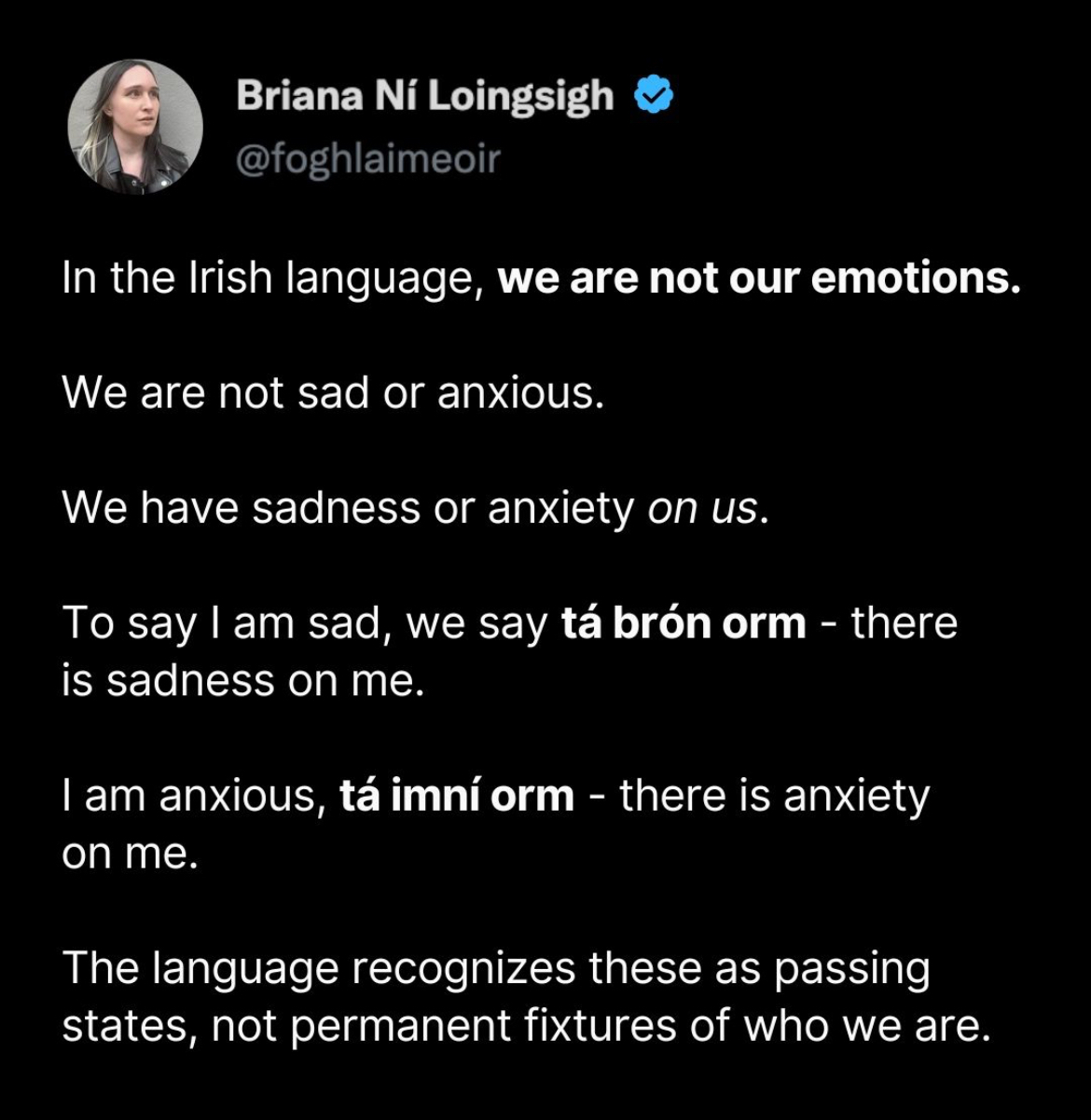 This is quite romantic, and I agree that we should be aware of our emotions as temporary, as clouds in the sky. However, the Irish language has not prevented the Irish people from having some of the highest rates of anxiety on Earth https://ourworldindata.org/grapher/anxiety-disorders-prevalence