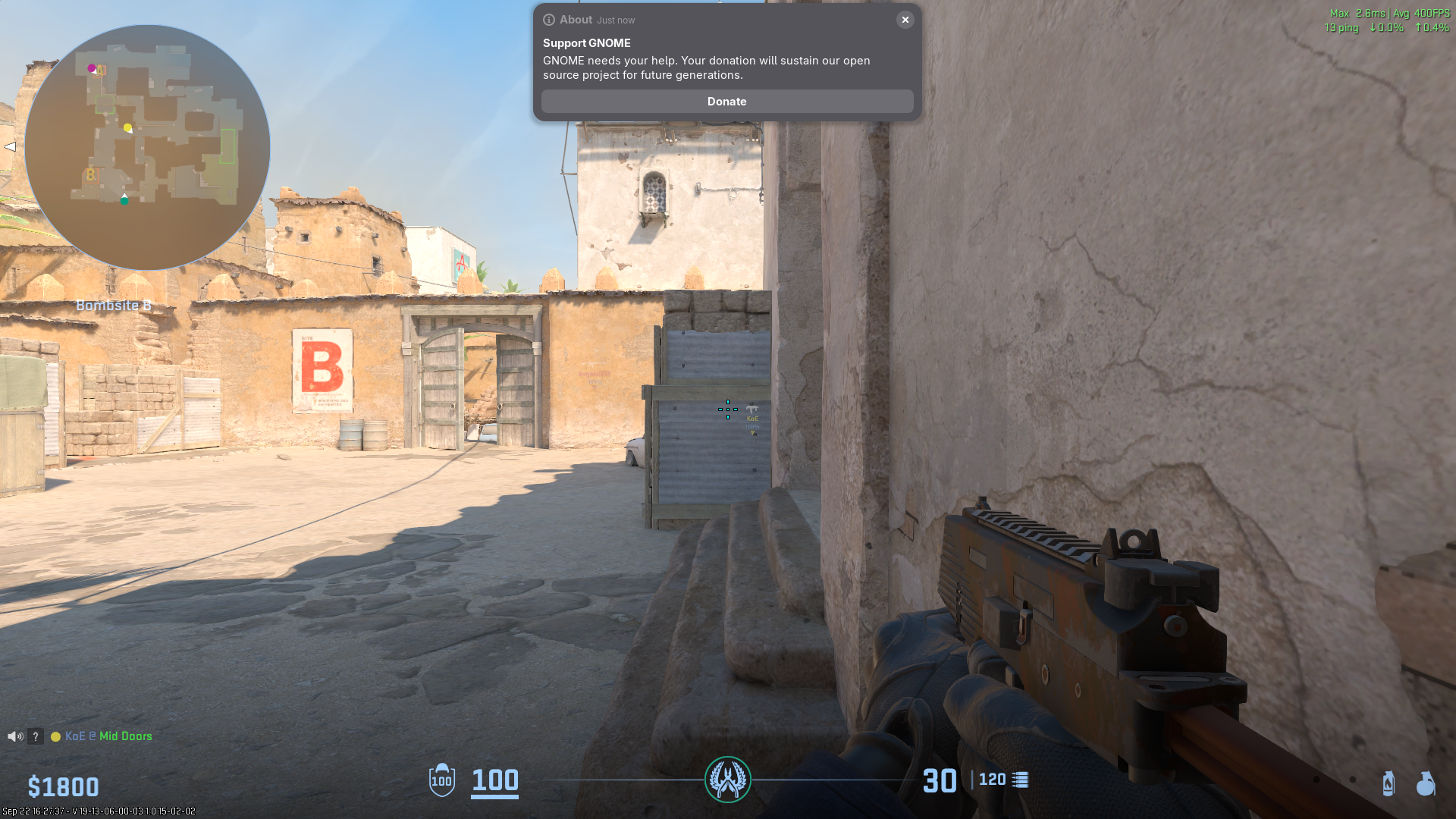 Playing some Counter-Strike 2 and then a GNOME donation notification pops up 😅